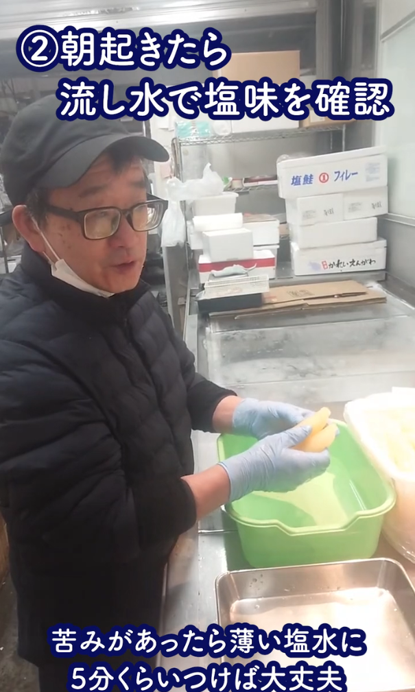 | 朝起きたら、まずは味見をしてみましょう。 「ん?ちょっと苦い?」と感じたら、漬けてた塩水よりも薄い、ちょっと塩辛いかな?くらいの塩水に5分くらい漬けてみてください。 やりすぎてしまうと水っぽくなってしまうので注意です! |