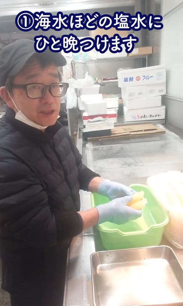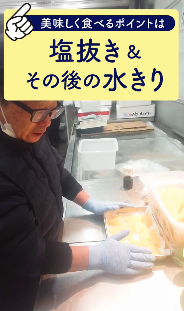 | ポイントは塩抜きと水切りです!塩抜きがうまくいかないと、調理液に漬けても味が染み込まなかったり、塩辛くて食べれなかったりしてしまいます・・・でも大丈夫! すごーく簡単なのでしっかりなぞってみてください! |