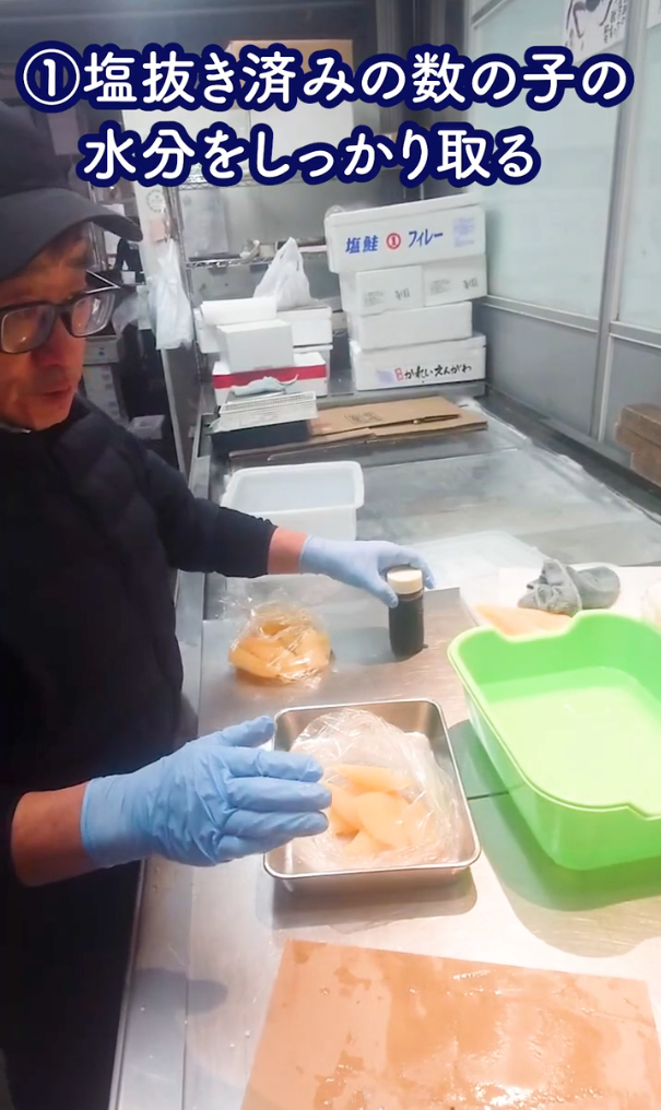 | ここまで読んでくれた方、ありがとうございました!レシピ通りにやっていただければ、オオゼキ特選・北海道産かずのこを最大限の魅力でお伝え出来るかなと思っています♪ 日進の干場さんも、日々お客様へ美味しいかずのこをお届け出来るよう、今日も豊洲市場で勤しんでいます!ここまでの流れを1分少々の動画にもまとめていますので、是非そちらもご覧ください♪ |