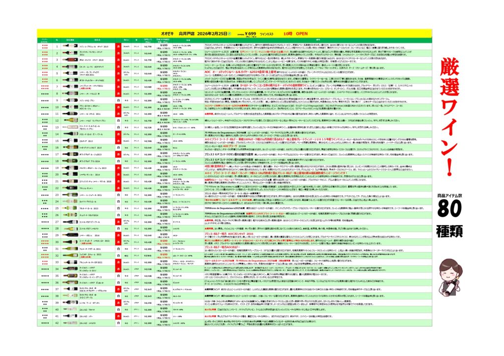 2/25(水)は高井戸店で699円均一ワインセールを実施します。