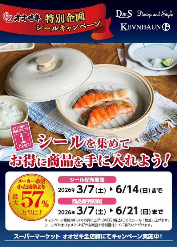 商品ごと規定枚数のシールを集めていただきますと、人気ブランドKEVNHAUNやD&Sのキッチン雑貨を特別価格でお買い求めいただけます。