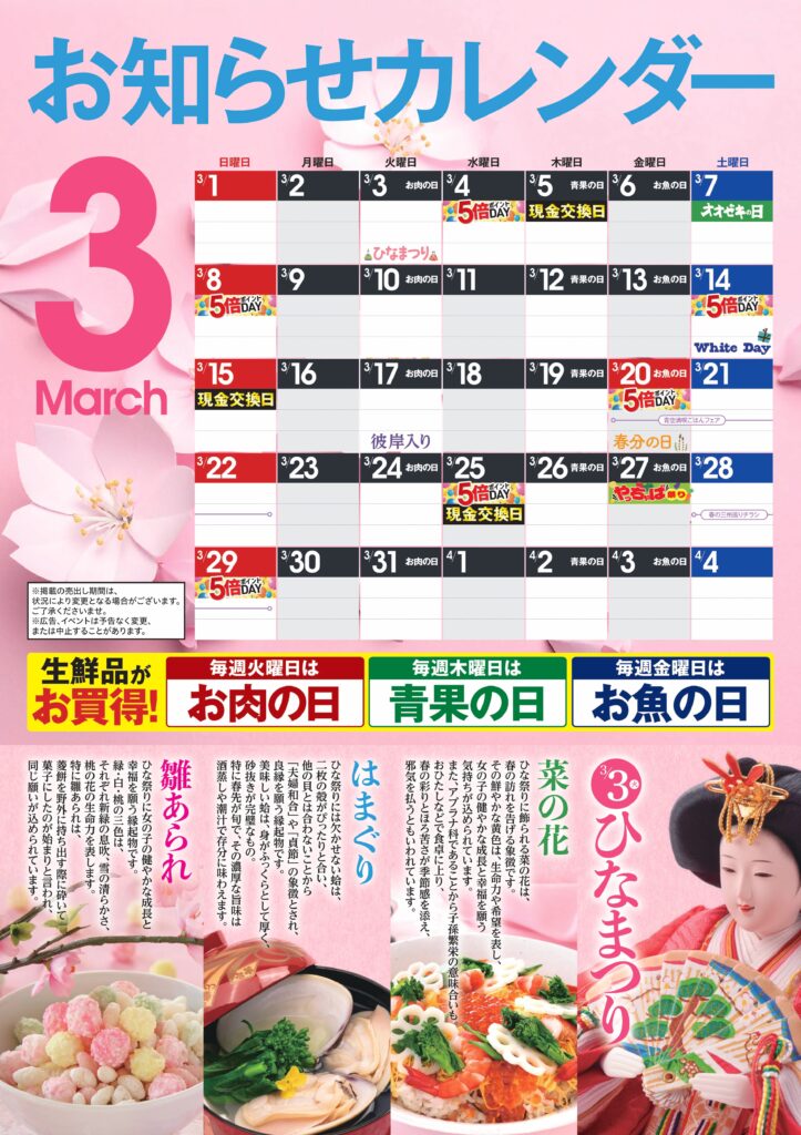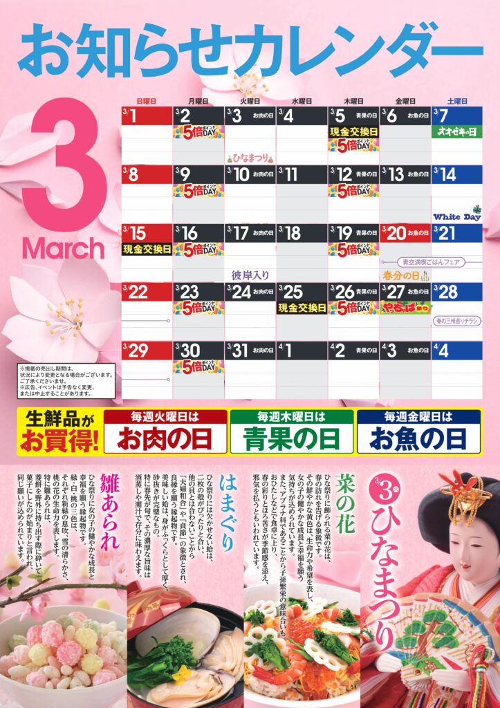 3月 オオゼキカレンダー 2026.03.03 店舗情報 これ以外にも店舗のオ得な情報盛りだくさん!! 詳しくは店頭でご確認ください。 ※浅草雷門店と中央林間店は対象外になります。 詳しくは下記をご覧ください。 【浅草雷門店版】 【中央林間店版】 お知らせ一覧を見る