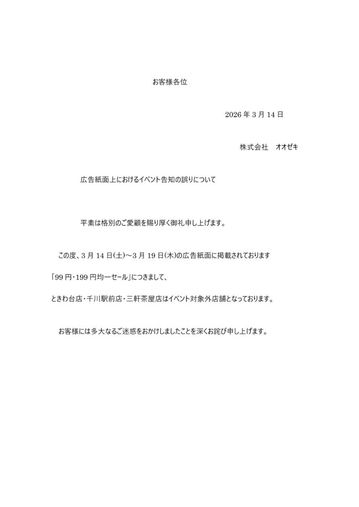 ときわ台店・千川駅前店・三軒茶屋店 広告の誤表記について