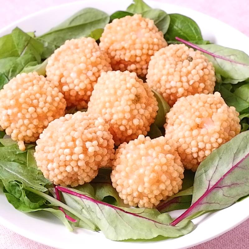 - 4 ボウルに入れ、2を加えてさっと混ぜ合わせ10等分にし丸型に形を整え小粒あられを全体につけます。