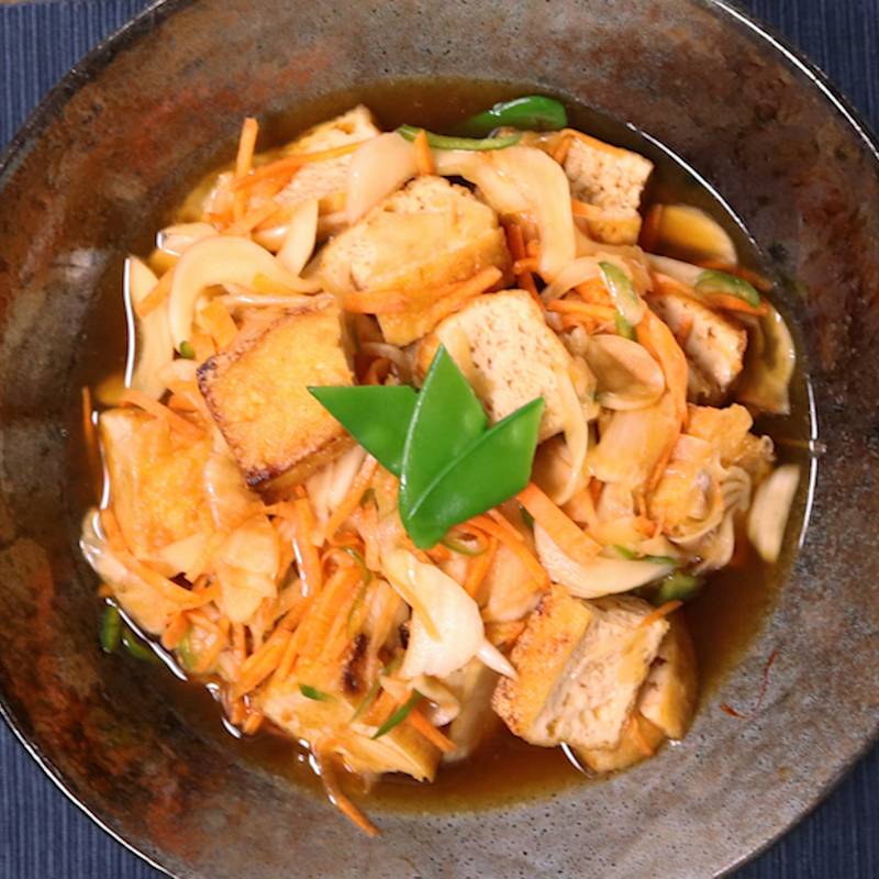 - 2 厚揚げをトースターで焦げ目がつくまで焼きます。