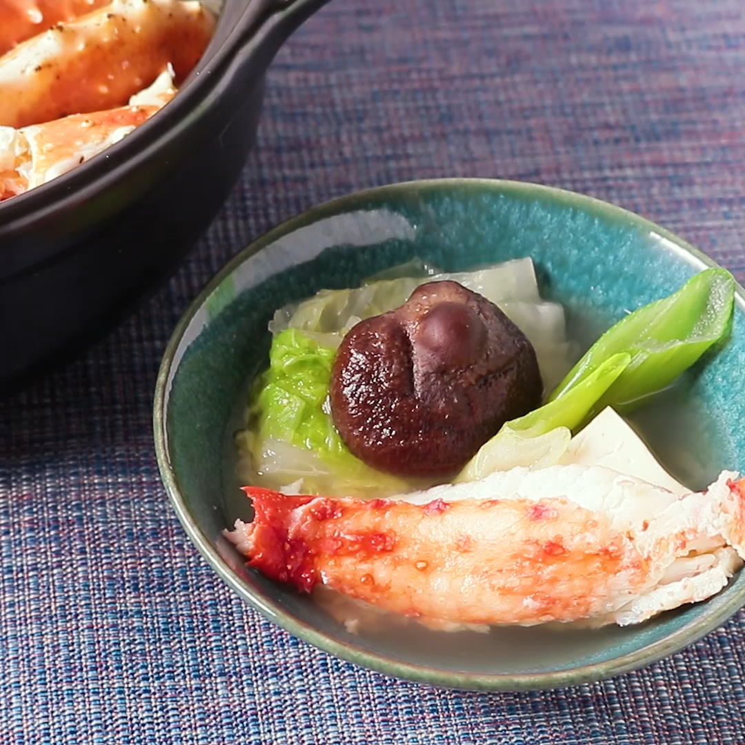 - 4 土鍋にスープの材料を入れ中火で熱し、煮立ったら、カニ、1、2を入れ、蓋をして8分程煮ます。