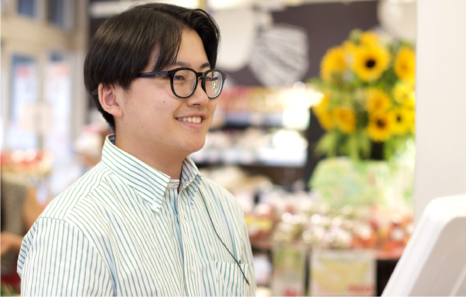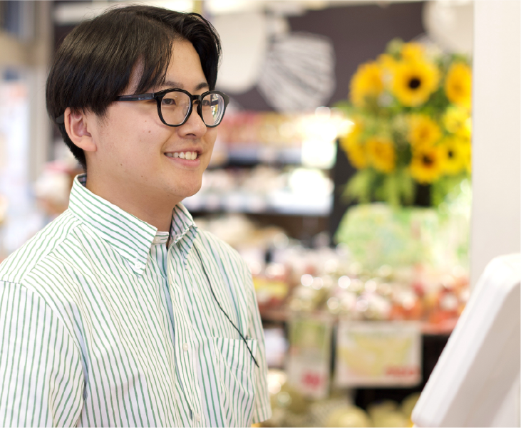 チェッカーの仕事はお客様だけでなく、他部門やスタッフとの連携も多く、日頃のコミュニケーションがとても大切です。僕も入社当初は会話が苦手で、限られた人としか話せませんでしたが、今では店舗全体としっかり関われるようになり、イベントの企画などで声をかけると、周囲が積極的に協力してくれるようになりました。チェッカー部門は「レジを打つだけ」ではありません。アイデア次第で工夫ができ、お客様から直接「ありがとう」と言ってもらえたり、名前を覚えてもらって会話が生まれたり、日々のやりとりにやりがいがあります。ルーティンだけでは物足りない、自分のアイデアを形にしたい方にぴったりの職場です。
