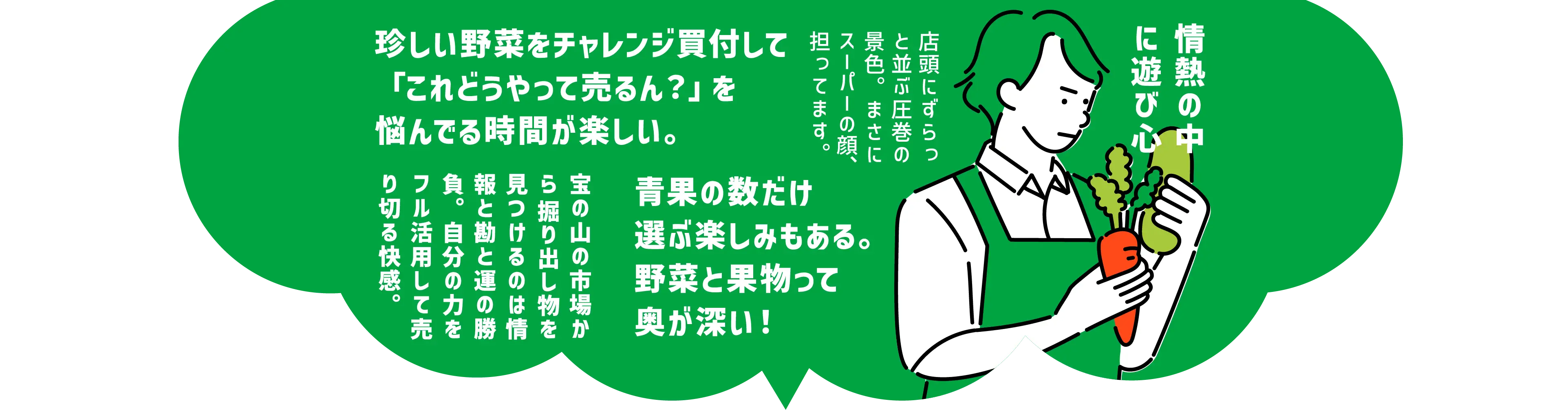 自分の目で選んだ青果を仕入れ、「どう並べよう?」「どうやっておすすめしよう?」毎日ちょっとした“仕掛け”の連続です。