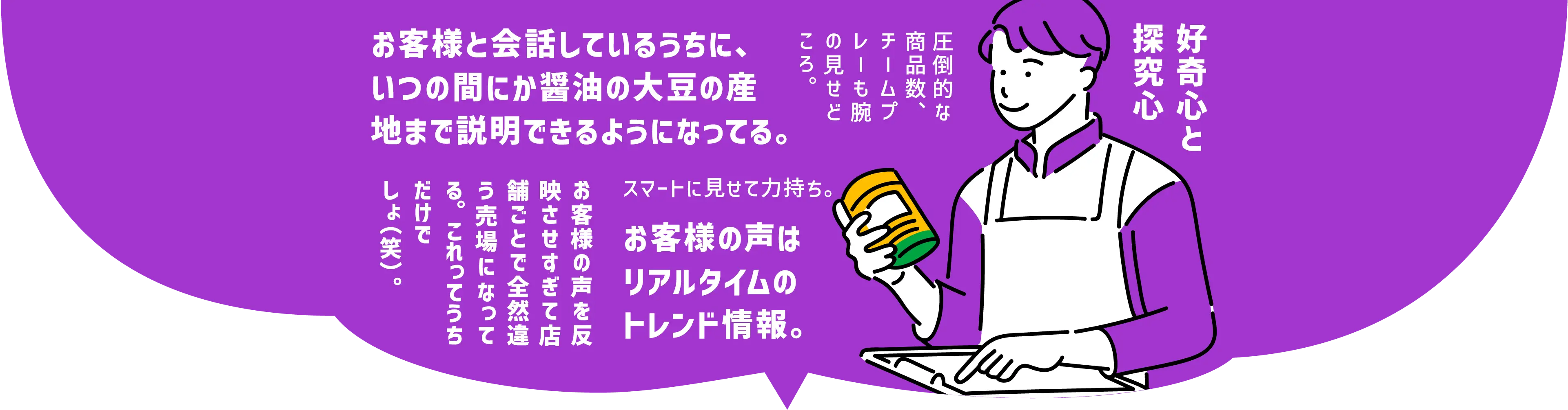 接客が好きな方はもちろん、問屋さんやメーカーさんと話す機会も多いので、商品知識を深めたい方や、探究心・コレクター気質がある人にもグロッサリーの仕事は面白いと思います。自分で仕入れて販売できるから、プライベートでスーパーに行っても、職業病が出ちゃうのも一つの特徴です。(笑)活気があって自由度も高いグロッサリー部は小売業で幅広い経験を積みたい方にはいい環境だなぁって思います。